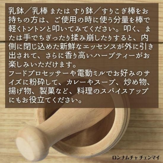 オーガニック先進国タイ北部チェンマイ郊外の恵まれた環境下で生き生きと育ったハーブ&スパイスは特有の深い風味があります。適切な自然環境で適切な時期に収穫し適切な乾燥処理をすることにより、最高に健康的な状態を保持します。